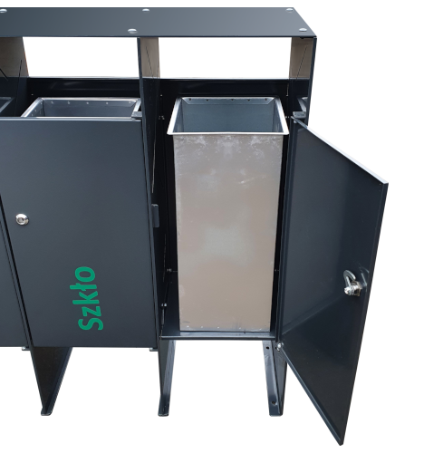 Estetyczny i funkcjonalny pojemnik do segregacji odpadów wykonany z blachy, pomalowanej proszkowo.