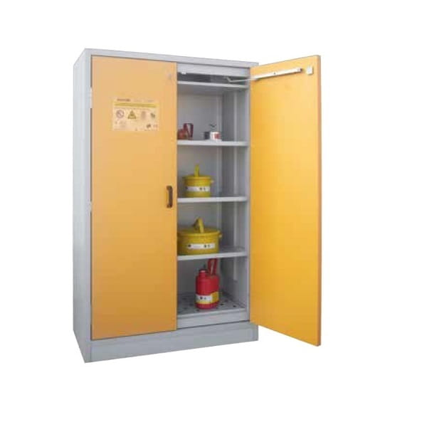 Szafa przeznaczona do przechowywania materiałów łatwopalnych (niebezpiecznych) w pomieszczeniach roboczych (laboratoria, hale produkcyjne), w pobliżu miejsca pracy, w klasie ognioodporności 30 min, zgodnie z normą EN14470-1.