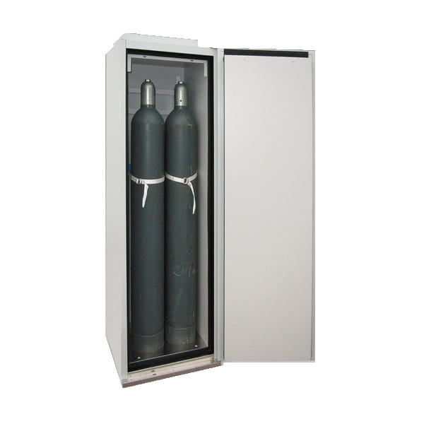 Szafa na butle przeznaczona do bezpiecznego przechowywania 2 sztuk butli ze sprężonym gazem 50 l w pomieszczeniach roboczych (laboratoria, hale produkcyjne), w pobliżu miejsca pracy w klasie ognioodporności 30 min, zgodnie z normą EN14470-2.