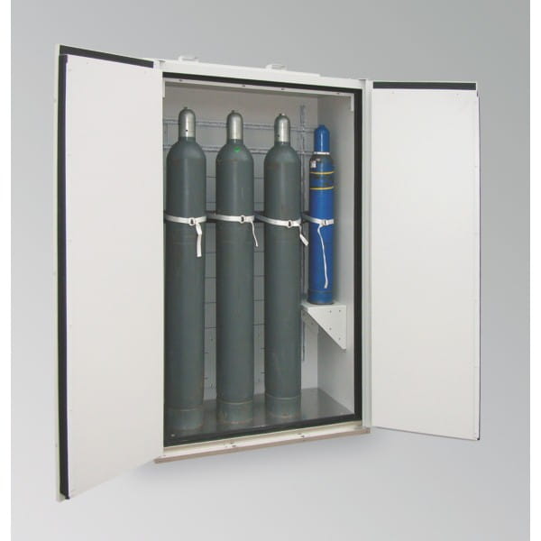Szafa na butle przeznaczona do bezpiecznego przechowywania 3 sztuk butli ze sprężonym gazem 50 l w pomieszczeniach roboczych (laboratoria, hale produkcyjne), w pobliżu miejsca pracy w klasie ognioodporności 30 min, zgodnie z normą EN14470-2.