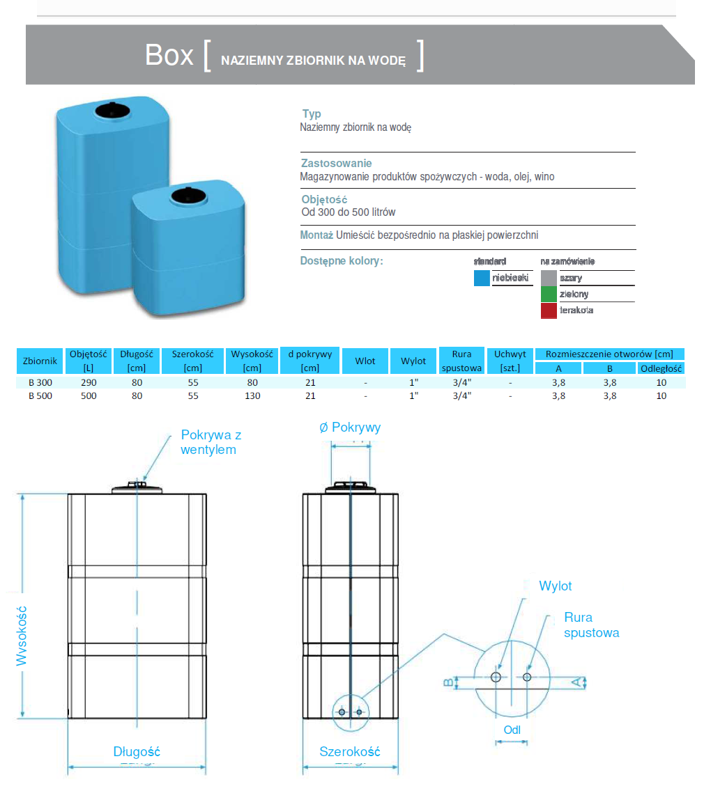 Zbiornik tego typu jest zbiornikiem na wodę pitną lub wodę deszczową. Zbiorniki z serii Box swym kształtem przypominają skrzynkę o prostokątnym kształcie podstawy z centralnie umiejscowioną pokrywą. Dzięki zastosowaniu przy produkcji technologii formowania rotacyjnego oraz właściwościom chemiczno-fizyczno-mechanicznym propylenu o wysokiej gęstości (LLDPE), są idealne do magazynowania dużych ilości płynów czy wody. Materiał z którego zbiornik został wykonany jest całkowicie nietoksyczny w związku z czym zbiornik jest bezpieczny dla użytkowników, materiał ten jednocześnie nie sprzyja rozwojowi glonów w cieczach w nich magazynowanych. Ponadto, polietylen jest odporny na zmiany temperatury (od -20 ° C do + 80 ° C) oraz na czynniki atmosferyczne, chemiczne i fizyczne. Polietylen z którego wykonany jest zbiornik, powoduje, że nie występują problemy utleniania lub korozji, które mogą mieć wpływ na właściwości zarówno mechaniczne jak i szczelność zbiornika. Cechy zbiornika jako monolitycznego produkt sprawiają, że jest on w 100% szczelnym zbiornikiem. Inną korzyścią wynikającą z zastosowania polietylenu jest znacznie mniejsza waga samego zbiornika co usprawnia, że jego transport i instalacja jest prostsza i ekonomiczna.