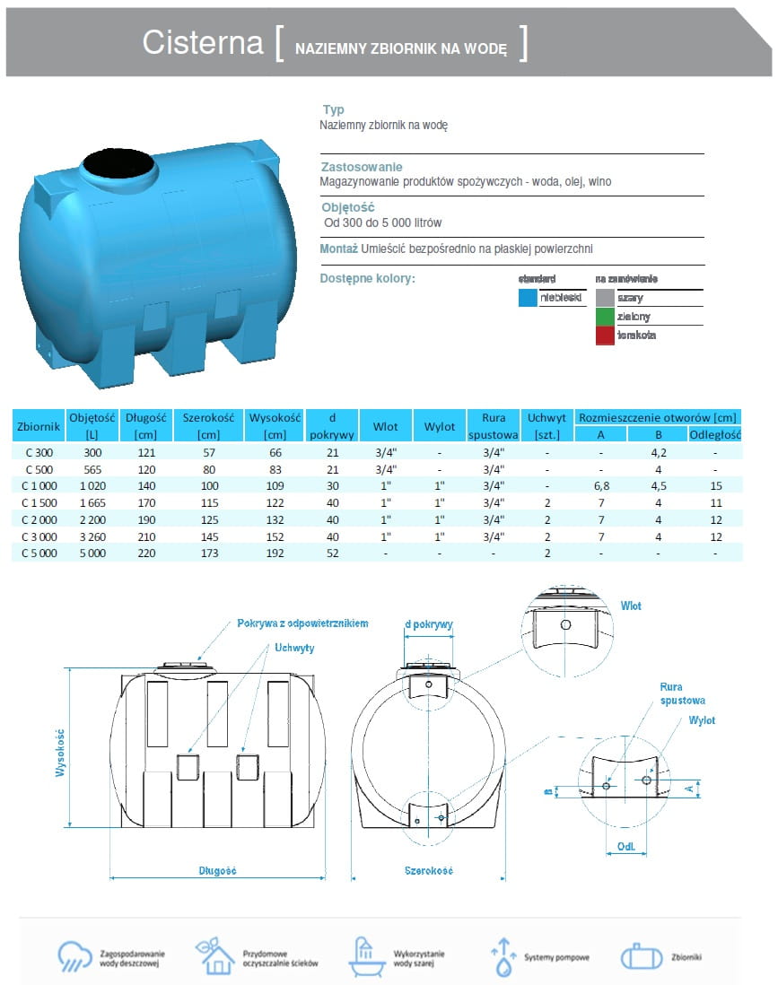 Zbiornik na wodę pitną i deszczową typu CISTERNA (Cysterna) przeznaczony jest do zbierania, magazynowania oraz wykorzystywania wody pitnej jak i deszczowej. Zbiornik na wodę z tego typu jest zbiornikiem o specjalnych cechach. W produkcji zbiornika stosowano technologię formowania rotacyjnego dzięki czemu zbiornik jest zbiornikiem bezszwowym - co sprawia, że tego typu zbiornik jest bardzo mocny i niesamowicie wytrzymały. Zbiornik może być wykorzystany do gromadzenia wody pitnej ale i deszczowej, efektywne wykorzystanie zasobów wody deszczowej w naszych gospodarstwach domowych, czy firmach skutkuje pozytywnym obniżenie kosztów związanych m.in. ze zużyciem wody pitnej.
