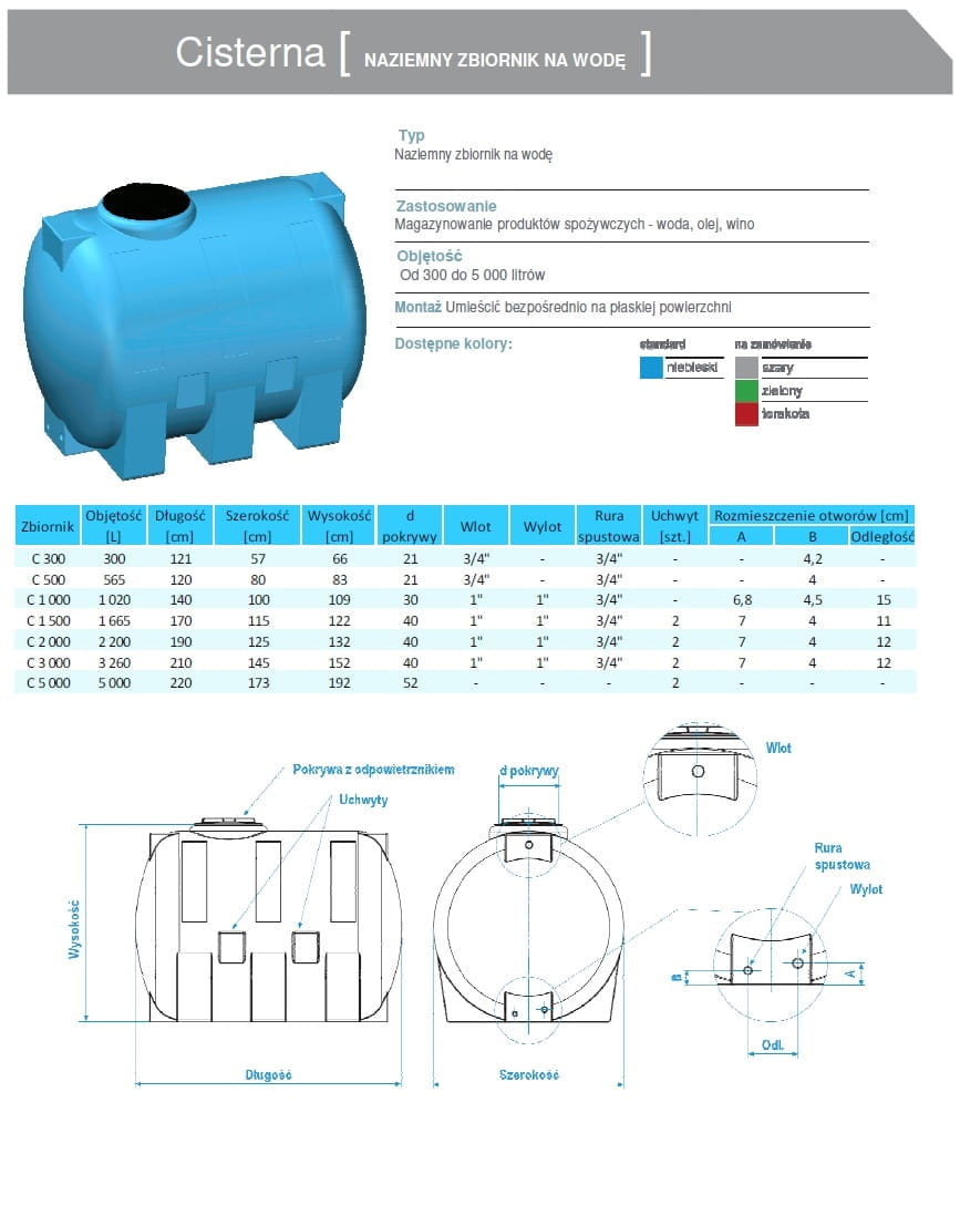 Zbiornik tego typu jest zbiornikiem na wodę pitną lub wodę deszczową. Zbiorniki z serii CISTERNA swym kształtem przypominają cysternę. Dzięki zastosowaniu przy produkcji technologii formowania rotacyjnego oraz właściwościom chemiczno-fizyczno-mechanicznym propylenu o wysokiej gęstości (LLDPE), są idealne do magazynowania dużych ilości płynów czy wody. Materiał z którego zbiornik został wykonany jest całkowicie nietoksyczny w związku z czym zbiornik jest bezpieczny dla użytkowników, materiał ten jednocześnie nie sprzyja rozwojowi glonów w cieczach w nich magazynowanych. Ponadto, polietylen jest odporny na zmiany temperatury (od -20 ° C do + 80 ° C) oraz na czynniki atmosferyczne, chemiczne i fizyczne. Polietylen z którego wykonany jest zbiornik, powoduje, że nie występują problemy utleniania lub korozji, które mogą mieć wpływ na właściwości zarówno mechaniczne jak i szczelność zbiornika. Cechy zbiornika jako monolitycznego produkt sprawiają, że jest on w 100% szczelnym zbiornikiem. Inną korzyścią wynikającą z zastosowania polietylenu jest znacznie mniejsza waga samego zbiornika co usprawnia, że jego transport i instalacja jest prostsza i ekonomiczna.