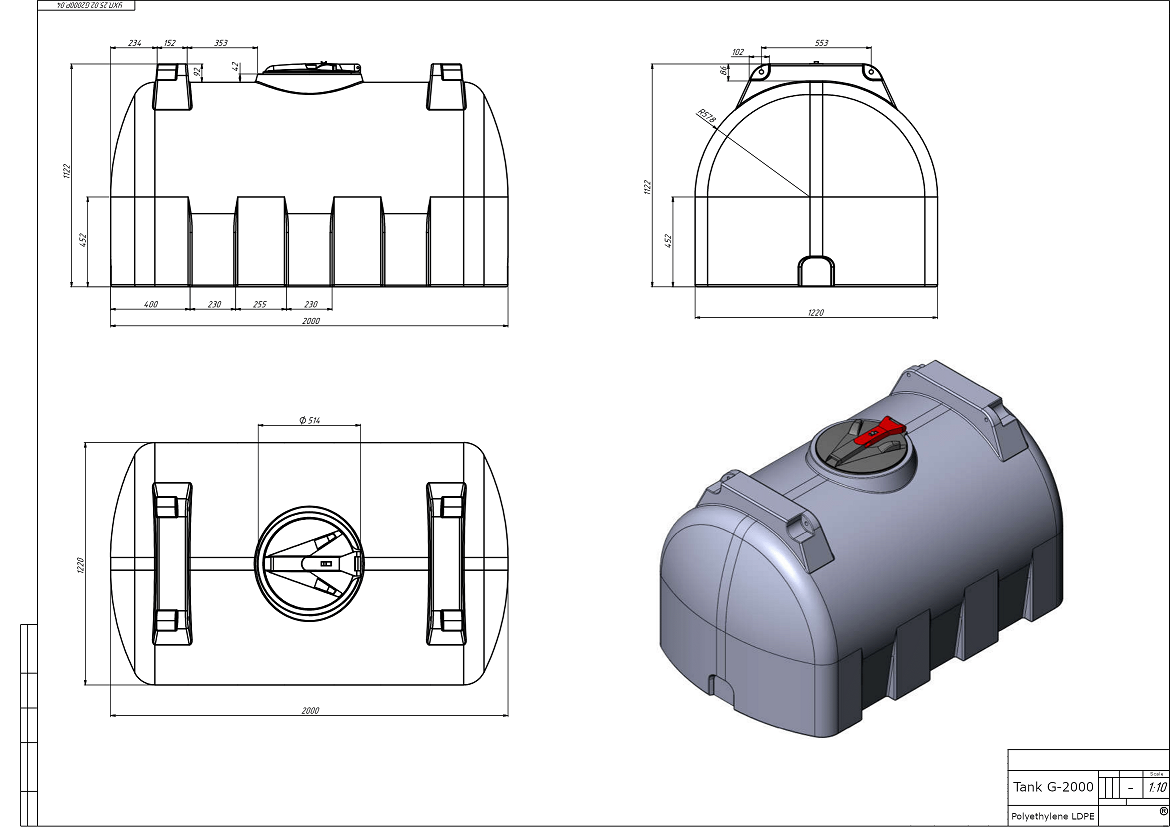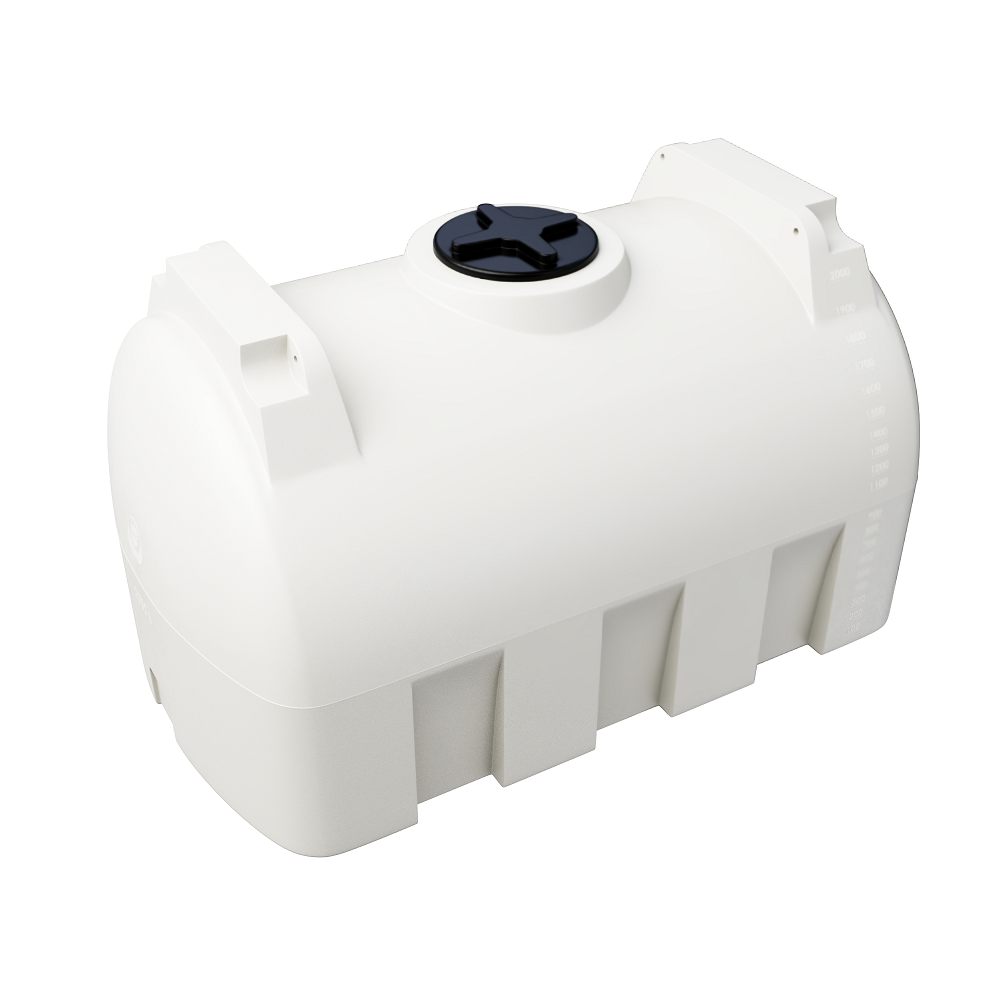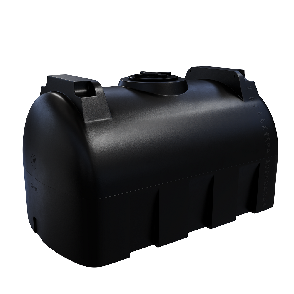 Poziomy zbiornik G-2000 z polietylenu o pojemności 2000 litrów (wysokość — 113 cm, długość — 200 cm,