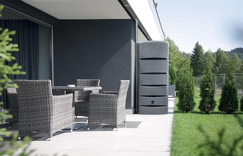 Estetyczny - modernistyczny - zbiornik na wodę deszczową. Idealnie pasuje do nowoczesnego budownictwa, doskonałe dopełnienie tak przestrzeni biurowej jak i domowej.