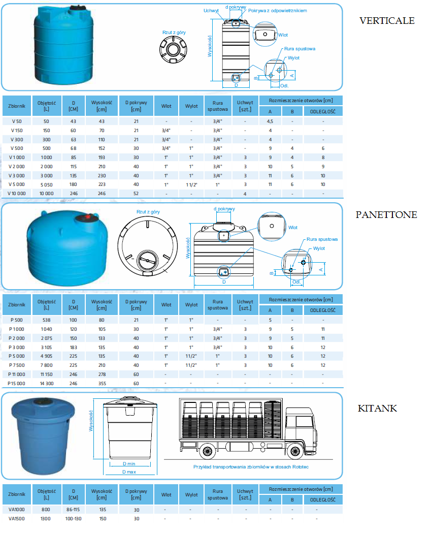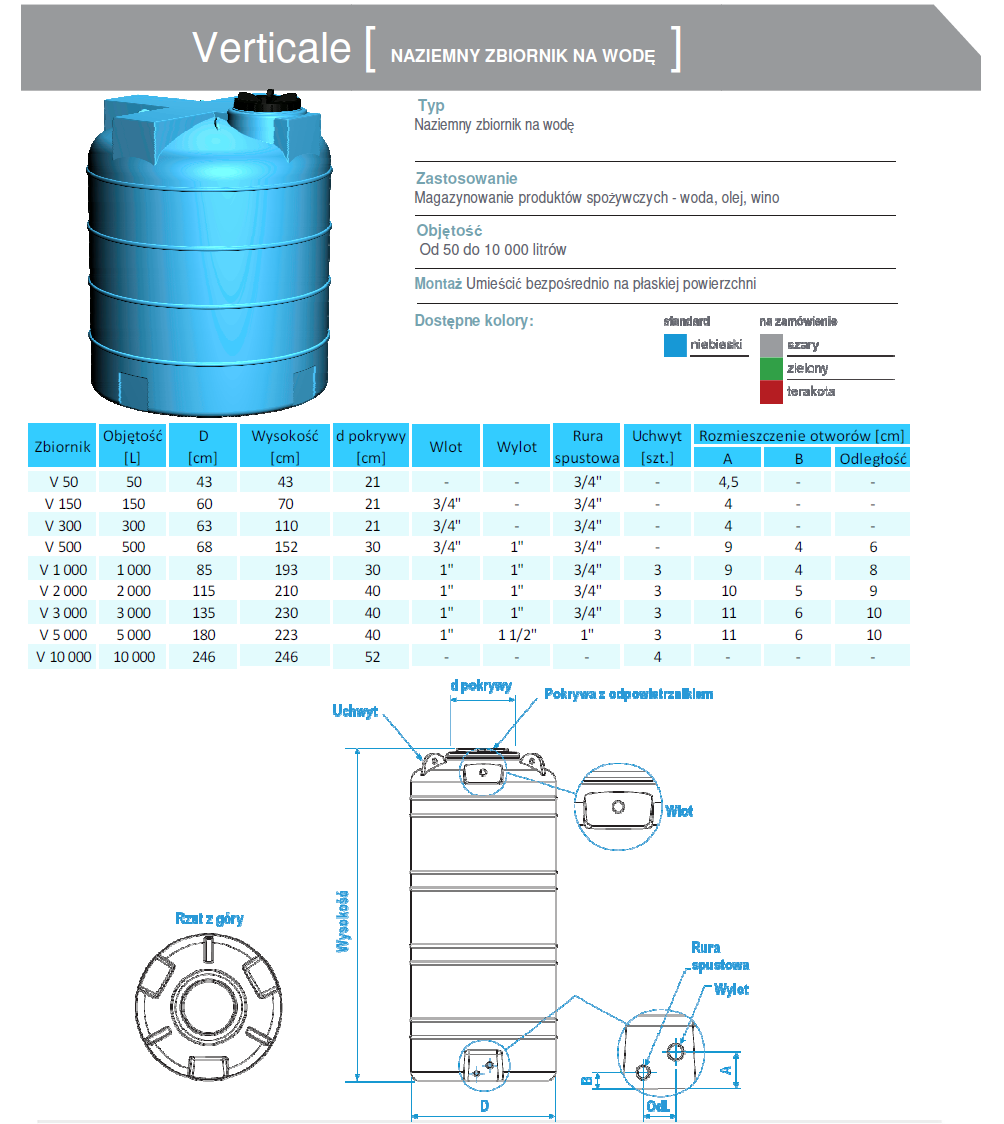 Zbiornik tego typu jest zbiornikiem na wodę pitną lub wodę deszczową. Zbiorniki z serii Verticale swym kształtem przypominają kolumnę są zbiornikami pionowymi. Dzięki zastosowaniu przy produkcji technologii formowania rotacyjnego oraz właściwościom chemiczno-fizyczno-mechanicznym propylenu o wysokiej gęstości (LLDPE), są idealne do magazynowania dużych ilości płynów czy wody. Materiał z którego zbiornik został wykonany jest całkowicie nietoksyczny w związku z czym zbiornik jest bezpieczny dla użytkowników, materiał ten jednocześnie nie sprzyja rozwojowi glonów w cieczach w nich magazynowanych. Ponadto, polietylen jest odporny na zmiany temperatury (od -20 ° C do + 80 ° C) oraz na czynniki atmosferyczne, chemiczne i fizyczne. Polietylen z którego wykonany jest zbiornik, powoduje, że nie występują problemy utleniania lub korozji, które mogą mieć wpływ na właściwości zarówno mechaniczne jak i szczelność zbiornika. Cechy zbiornika jako monolitycznego produkt sprawiają, że jest on w 100% szczelnym zbiornikiem. Inną korzyścią wynikającą z zastosowania polietylenu jest znacznie mniejsza waga samego zbiornika co usprawnia, że jego transport i instalacja jest prostsza i ekonomiczna.
