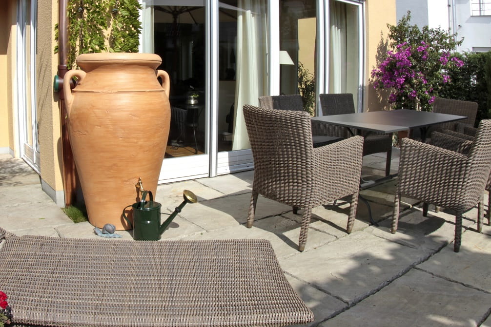 Wykonany z tworzywa bardzo estetyczny zbiornik na wodę deszczową.