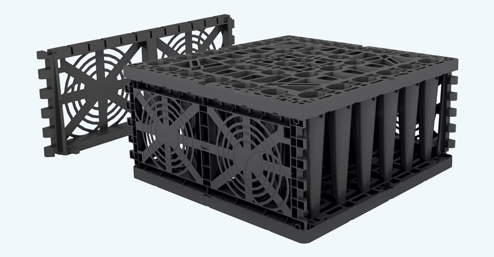 Proponujemy zbiorniki rozsączające (kompletne zestawy) zbudowane z modułów 800/800/350 mm (płyta denna h=40 mm).