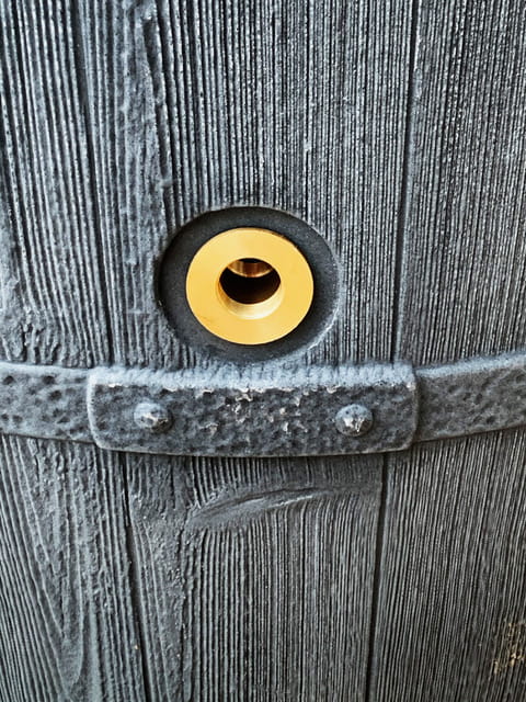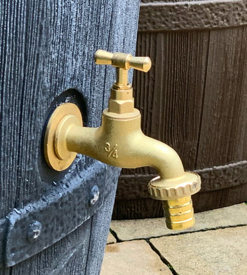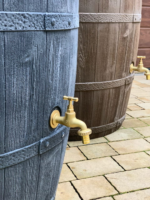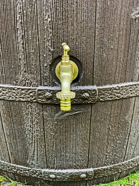 Zbiornik na deszcz z frontu wyposażony jest w mosiężny kranik.