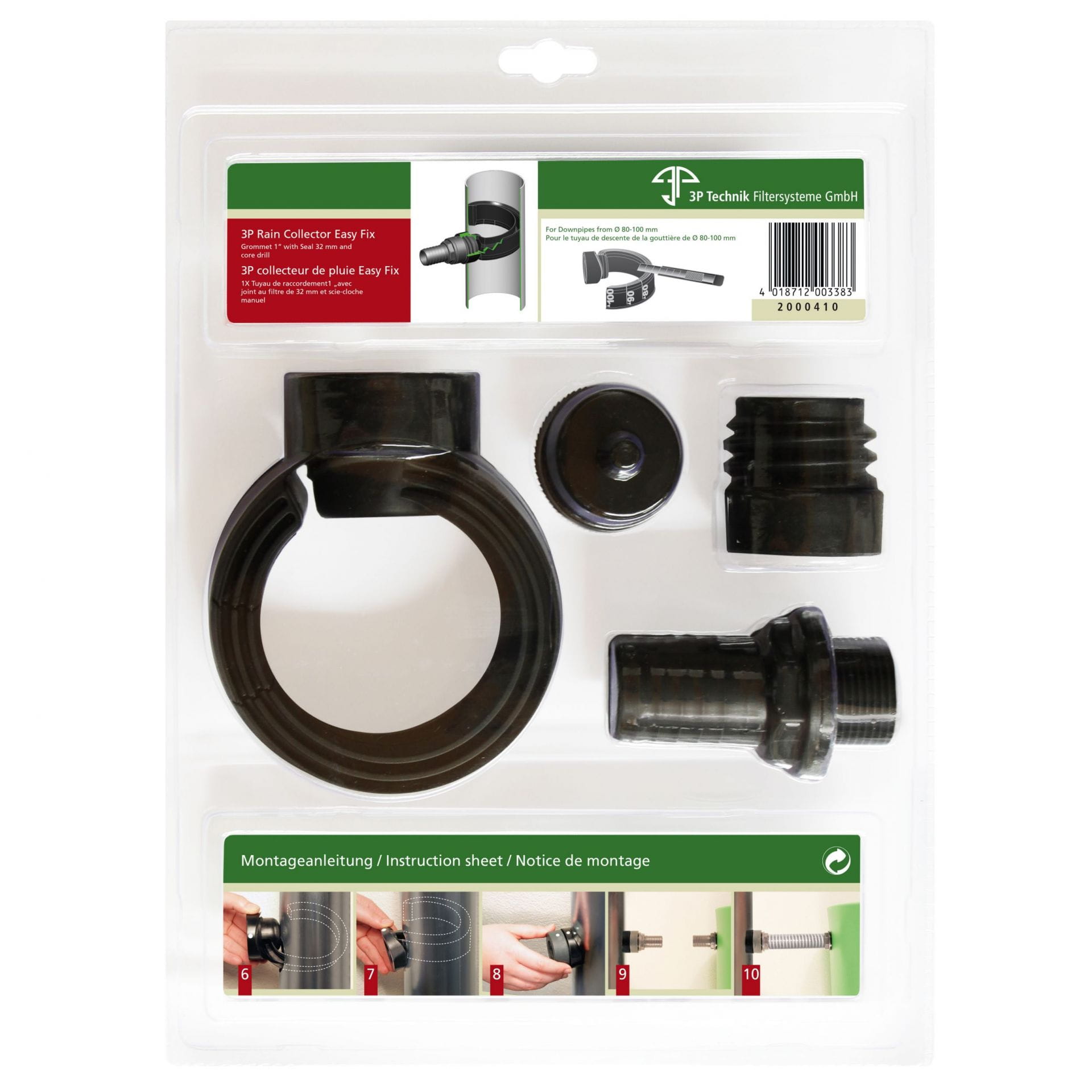 Wykorzystuje się w nim mało-inwazyjny sposób zbierania wody deszczowej z rur spustowych. Zestaw zawiera zbieracz wody do rynien o średnicy 80–100mm, wyrzynarkę do rynien, wężyk połączeniowy, króciec oraz wyrzynarkę do zbiornika. Easyfix – wersja bez wężyka i króćca do zbiornika.