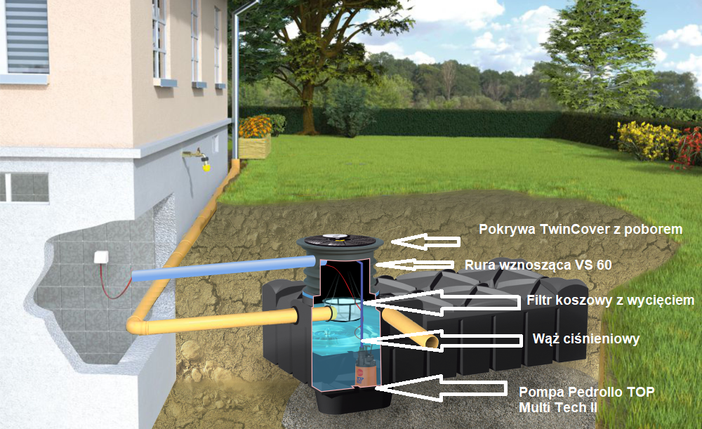 Zmagazynowana w zbiorniku woda deszczowa dzięki zbiornikowi, może być wykorzystana w ogrodzie zwykle do podlewania, mycia, ale też do innych celów. Pobór wody dokonuje się z przez podpięcie węża do pokrywy TwinCover z poborem - pokrywa to element, który za pomocą węża ciśnieniowego będzie połączony z pompą automatyczną znajdującą się w zbiorniku. Dzięki pokrywie TwinCover z poborem w pełni możemy korzystać z opcji, które oferuje nam zestaw Standard do zbierania deszczówki.