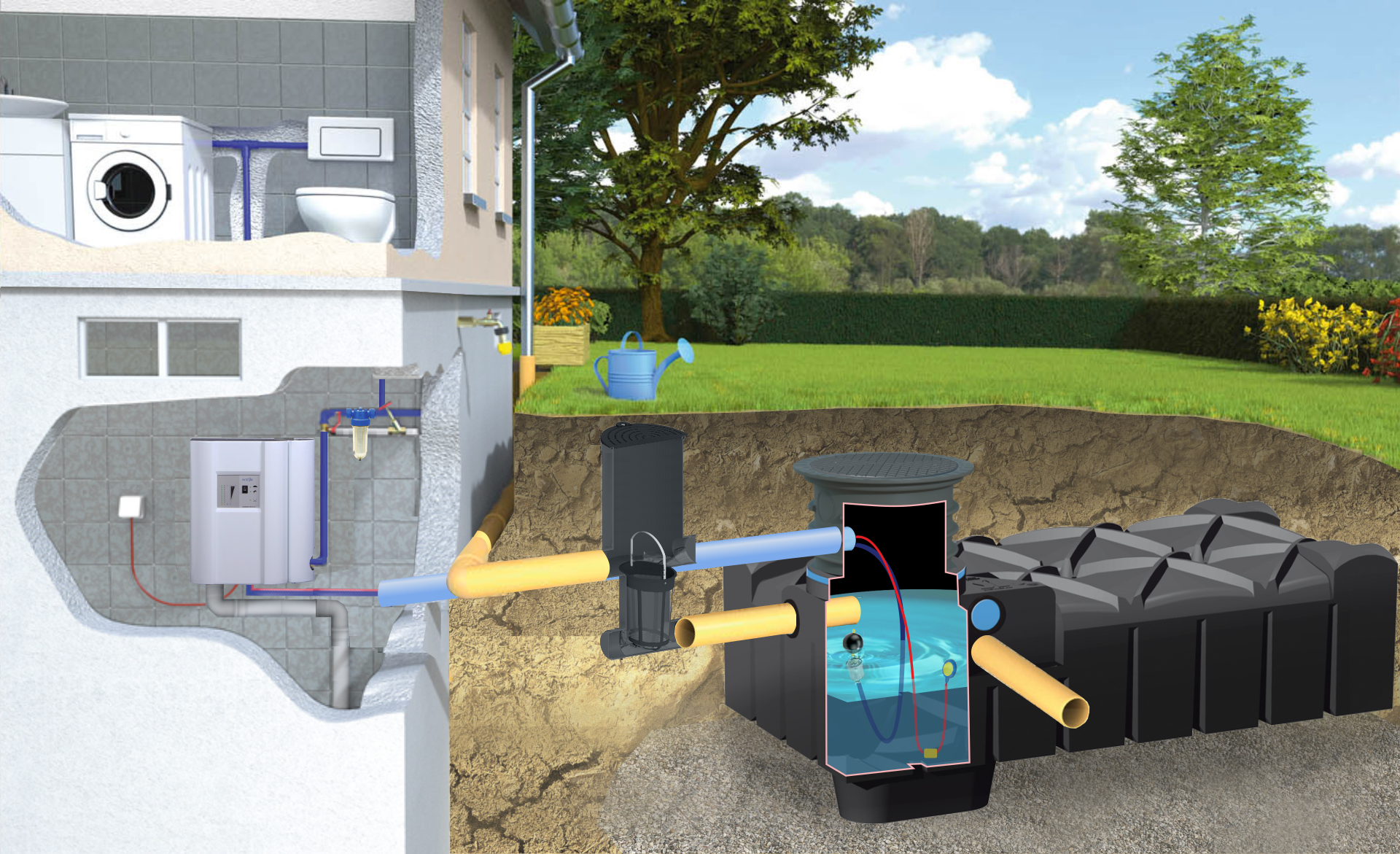 Gotowy do użycia zestaw do wody deszczowej - ze zbiornikiem F-line, głównie do posadowienia, tam gdzie są grunty przepuszczalne np. piaski.