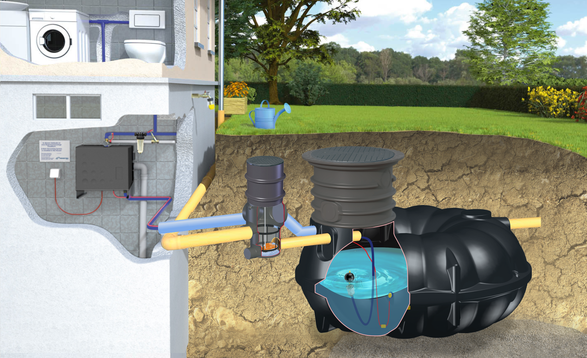 Zestaw po zainstalowaniu pozwala na uniezależnienie się od poboru wody wyłącznie z sieci. Działa on w następujący sposób: podczas o deszczu woda z dachu danego pomieszczenia z wykorzystaniem rynien czy innych odpływów trafia do podziemnego zbiornika o danej pojemności. Woda deszczowa zostaje oczyszczona za pomocą filtra Maxi, pozwalającego odseparować zanieczyszczenia i liście spływające z wodą deszczową do zbiornika. Zmagazynowana w zbiorniku woda deszczowa dzięki centrali deszczowej (pompie), może być wykorzystana w domu np. w toaletach, w ogrodzie zwykle do podlewania, mycia, ale też do innych celów. Pobór wody dokonuje się z wykorzystaniem centralii deszczowej AQUAMATIC DOMESTIC C PLUS